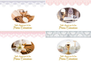 Foglio A4 contenente 20 talloncini prefustellati bomboniera + cofanetto portaconfetti coordinato, per Comunione, con decori stampa a caldo, personalizzabili con stampanti comuni.