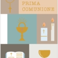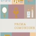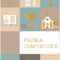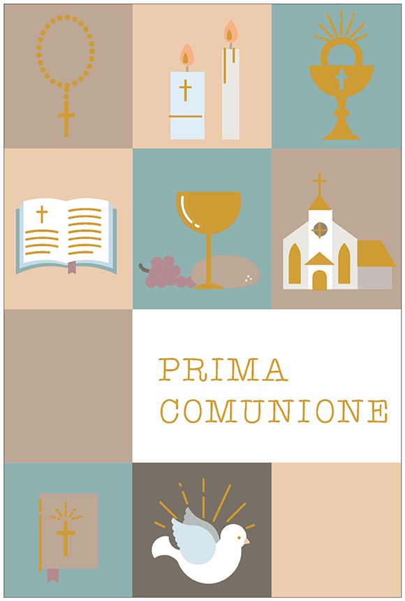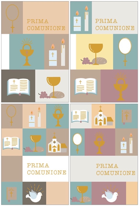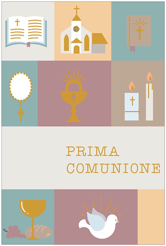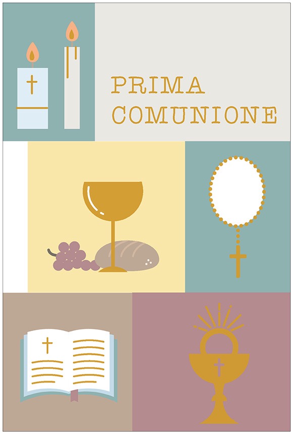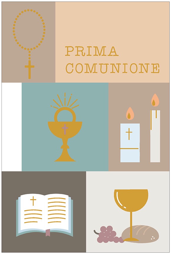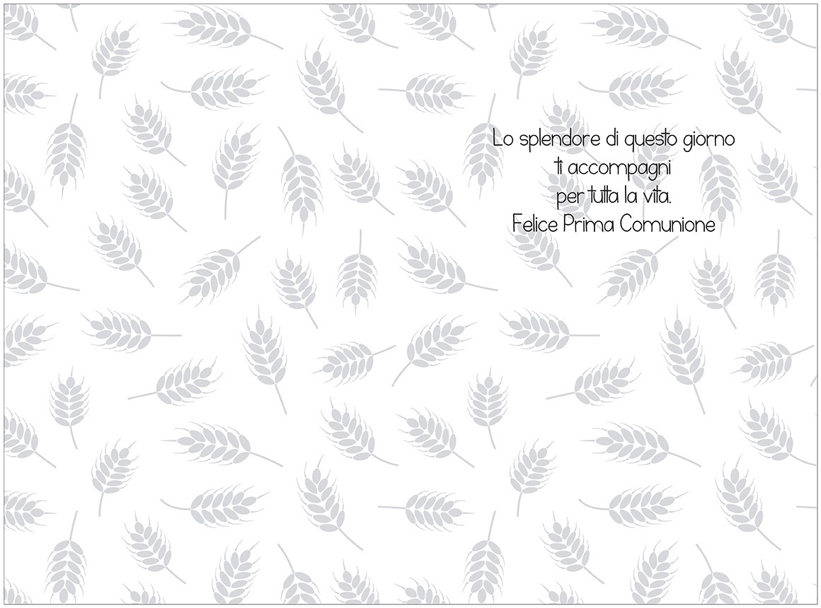 Biglietto augurale per Comunione, con nobilitazione lamina oro, testo interno e stampa interna.