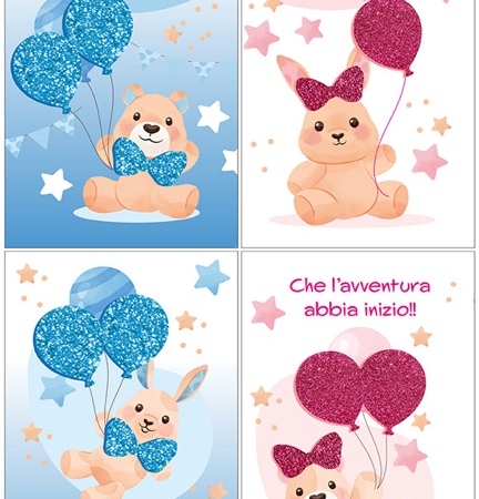 Foglio A4 contenente 20 talloncini prefustellati bomboniera + cofanetto portaconfetti coordinato, per nascita/Battesimo, con decori stampa a caldo, personalizzabili con stampanti comuni.