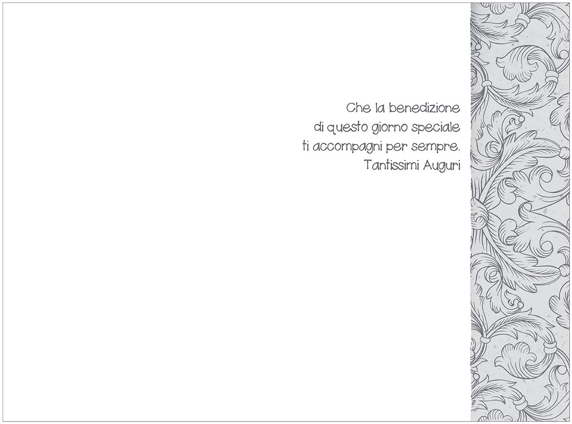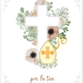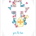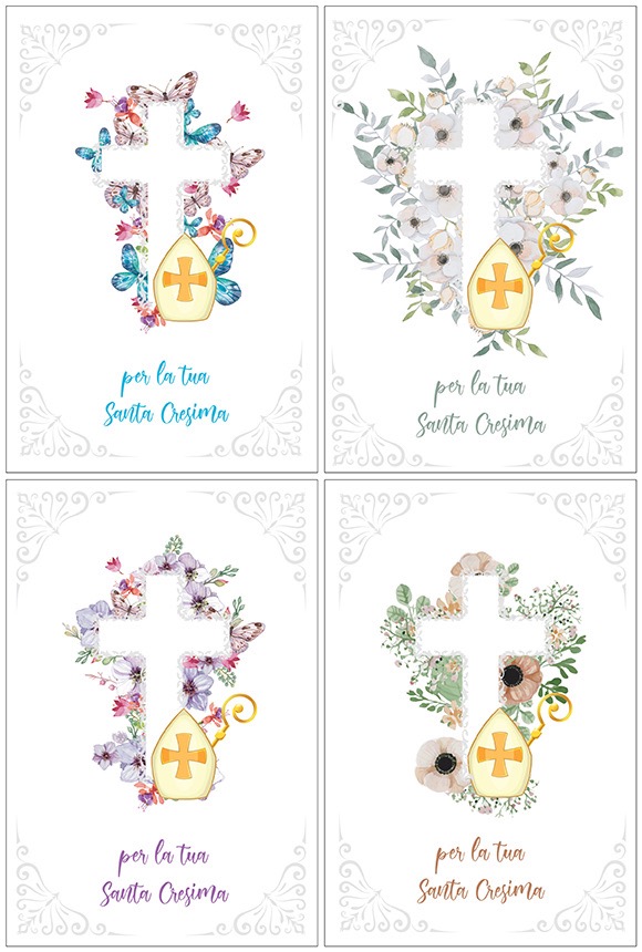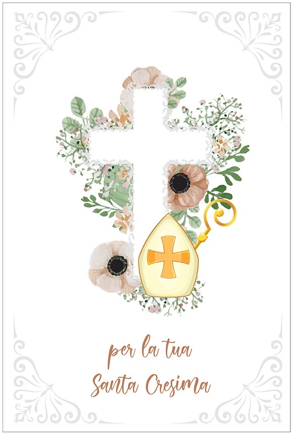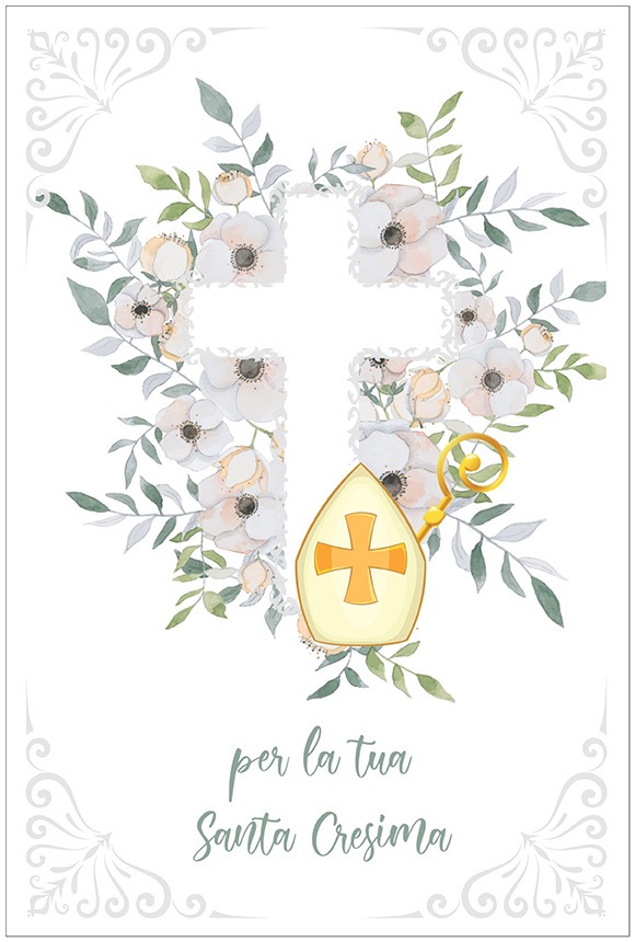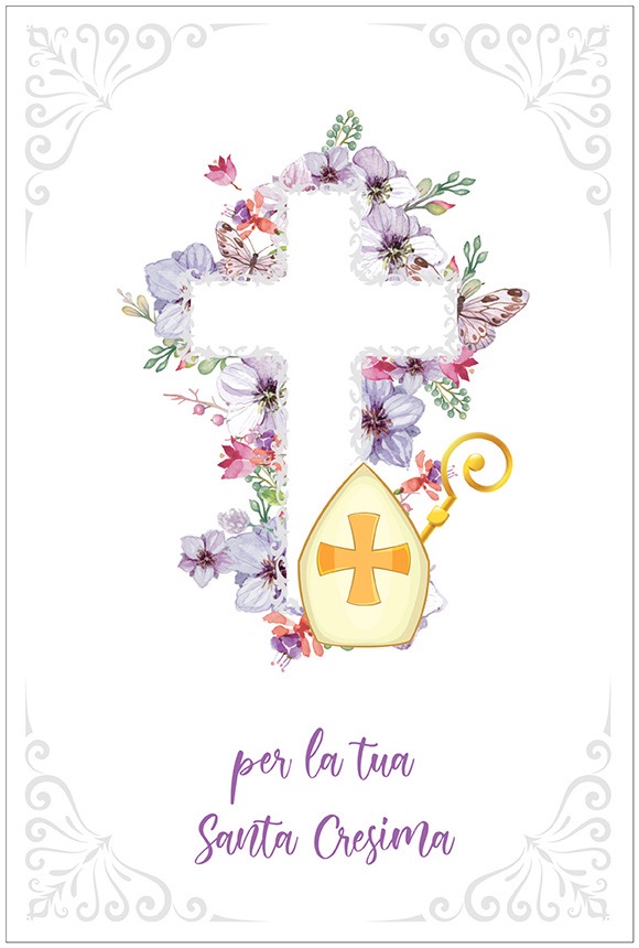 Biglietto augurale per Cresima, con nobilitazione glitter, rilievo, testo interno e stampa interna.
