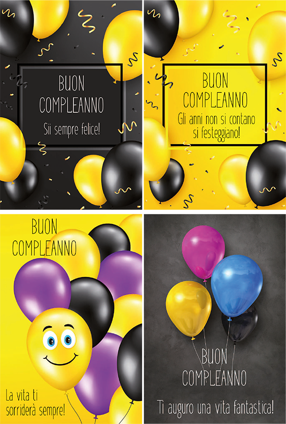 Busta di colore giallo Biglietto e busta cellophanati singolarmente con materiale antistatico Confezionati in scatole in acetato trasparente da 12 biglietti assortiti in 4 soggetti