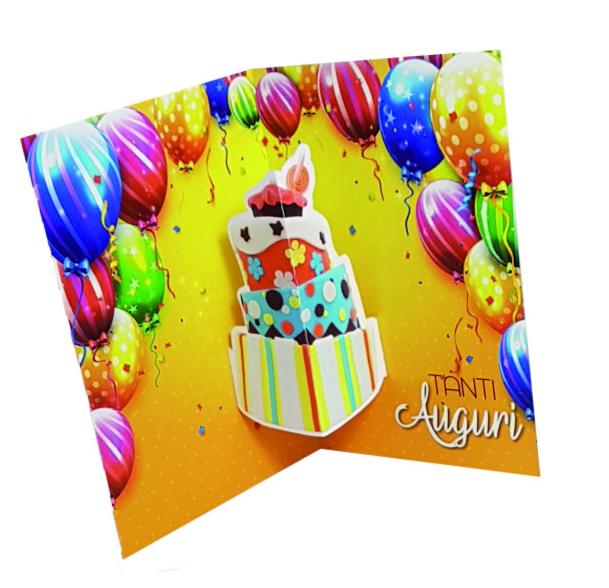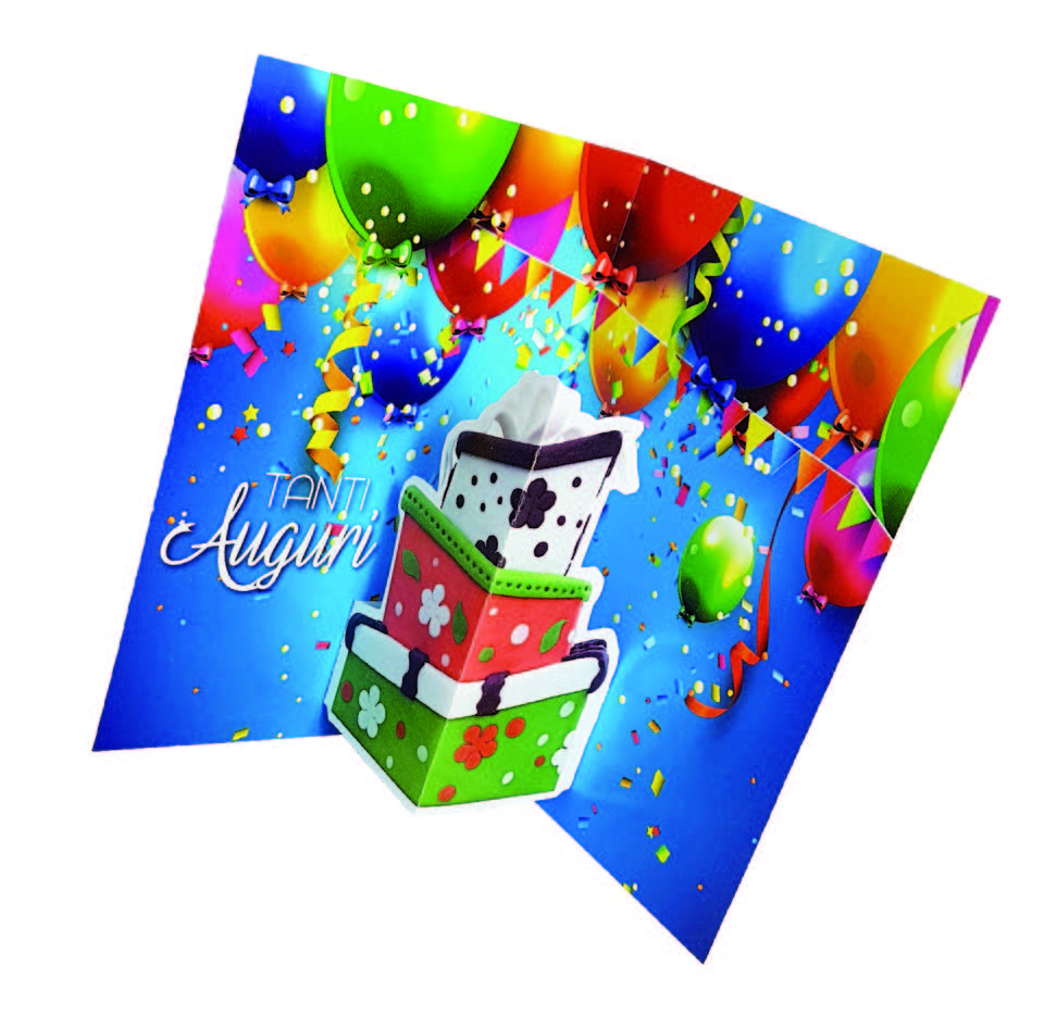 Biglietto augurale di buon compleanno POP UP, con nobilitazione glossy, stampa interna a colori.