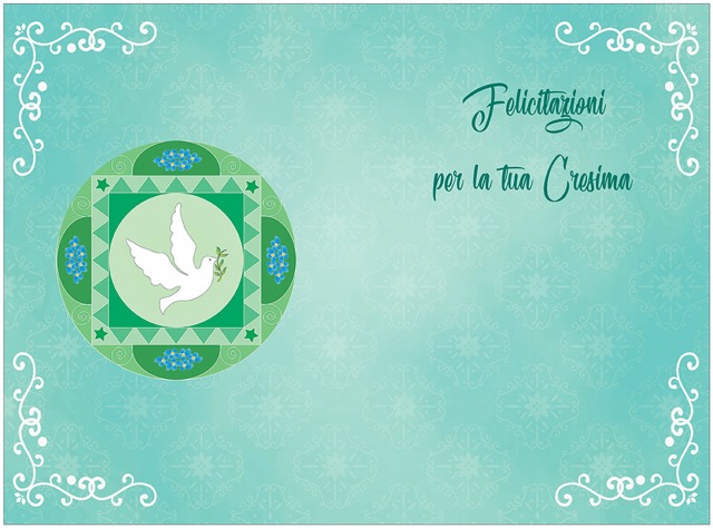 Biglietto augurale per Cresima, con nobilitazione glitter, testo interno e stampa interna.